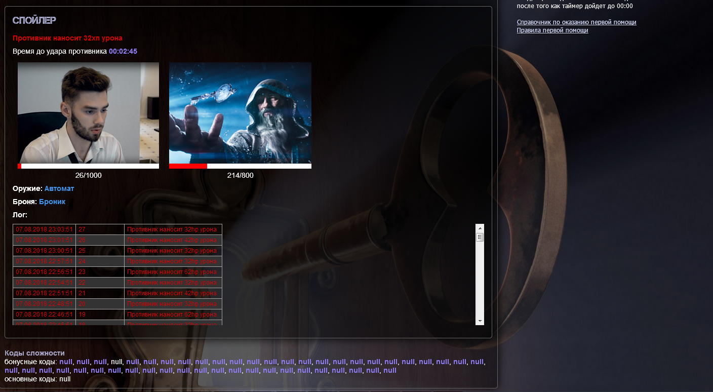 Бой — от 1250₽. Противник с заданым интервалом времени наносит урон персонажу. Полевые коды наносят урон противнику, а часть из них лечат персонажа.